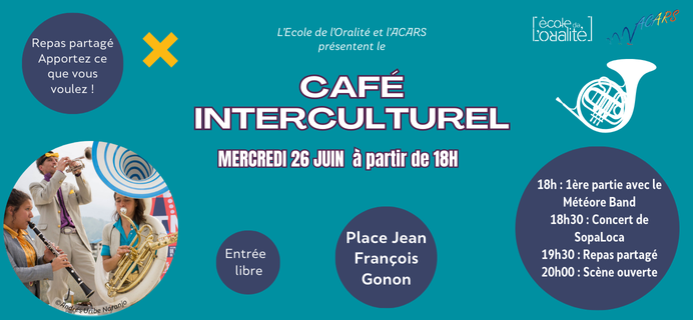 Rejoignez nous au Café Interculturel du 26 juin dès 18h à la place Jean François Gonond : 1ère partie avec l'ensemble de cuivres "Le Météore Band", suivi d'un concert du groupe SolaLoca avec leur spectacle Calle Loca et d'un repas partagé !