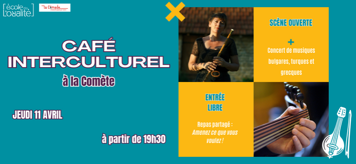 Rejoignez nous au Café Interculturel du 11 avril : Concert de musiques bulgares, grecques et turques au rendez-vous ! Les cafés interculturels sont des soirées mettant à l’honneur musique traditionnelle et musique du monde, offrant à la fois une programmation professionnelle et amateure. Un concert, un repas partagé et une scène ouverte pour soutenir l’émergence de talents locaux et encourager la pratique artistique amateure.