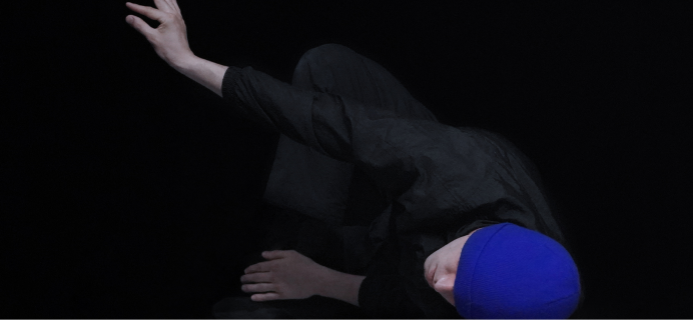 Le danseur Jazz Barbé, vêtu de noir et coiffé d’un bonnet bleu électrique, évolue dans un univers oscillant entre rêve et réalité. Il incarne l’art de contorsionner son corps et de se mouvoir au sol avec une aisance infinie. Loin des mouvements frénétiques, chaque geste, presque suspendu, prend une dimension particulière, et chaque action, aussi discrète soit-elle, revêt une profonde signification.